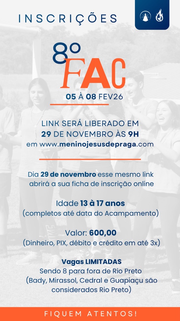 Dia <b>29 de novembro às 9h</b> esse link abrirá a sua ficha de inscrição online.<br> <br> <br> Para adolescentes de 13 a 17 anos no dia do acampamento, valor <b>600,00</b> (Dinheiro, PIX e cartão até 3x )<br> <br> Vagas: 64 femininas / 48 masculinas, sendo 8 para fora de Rio Preto (Bady, Mirassol, Cedral e Guapiaçu são considerados Rio Preto).<br> <br> Após a inscrição online o campista deverá levar a ficha de inscrição, o termo de responsabilidade assinado e efetuar o pagamento, no dia <b>03 de dezembro das 19 às 20h</b> , no salão paroquial da Paróquia Menino Jesus de Praga.<br> <br> Caso, não compareça com todos os documentos solicitados acima e/ou não efetue o pagamento da taxa de inscrição, a vaga será automaticamente liberada.